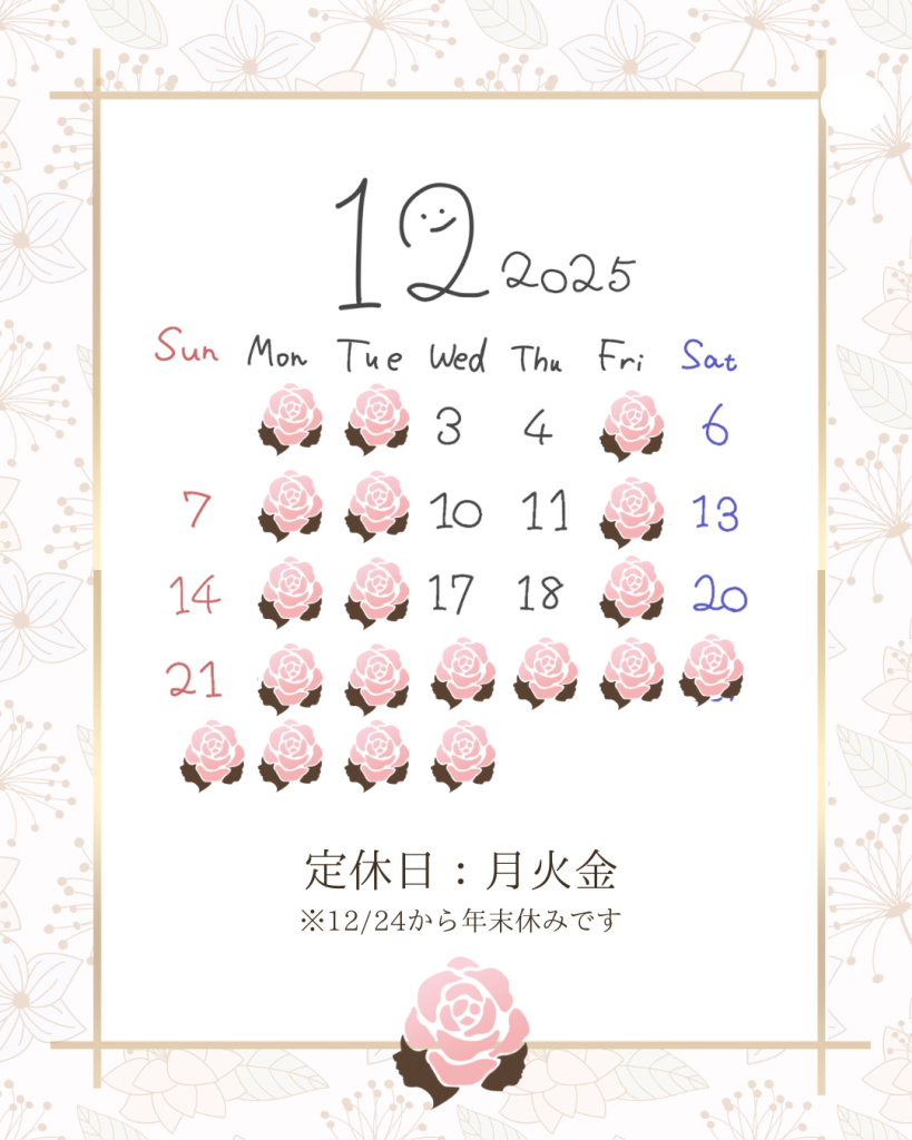 12月は上記の通り営業致します。 マタニティマッサージ、会陰マッサージレッスンのご予約はHotPepperBEAUTYより受け付けております。